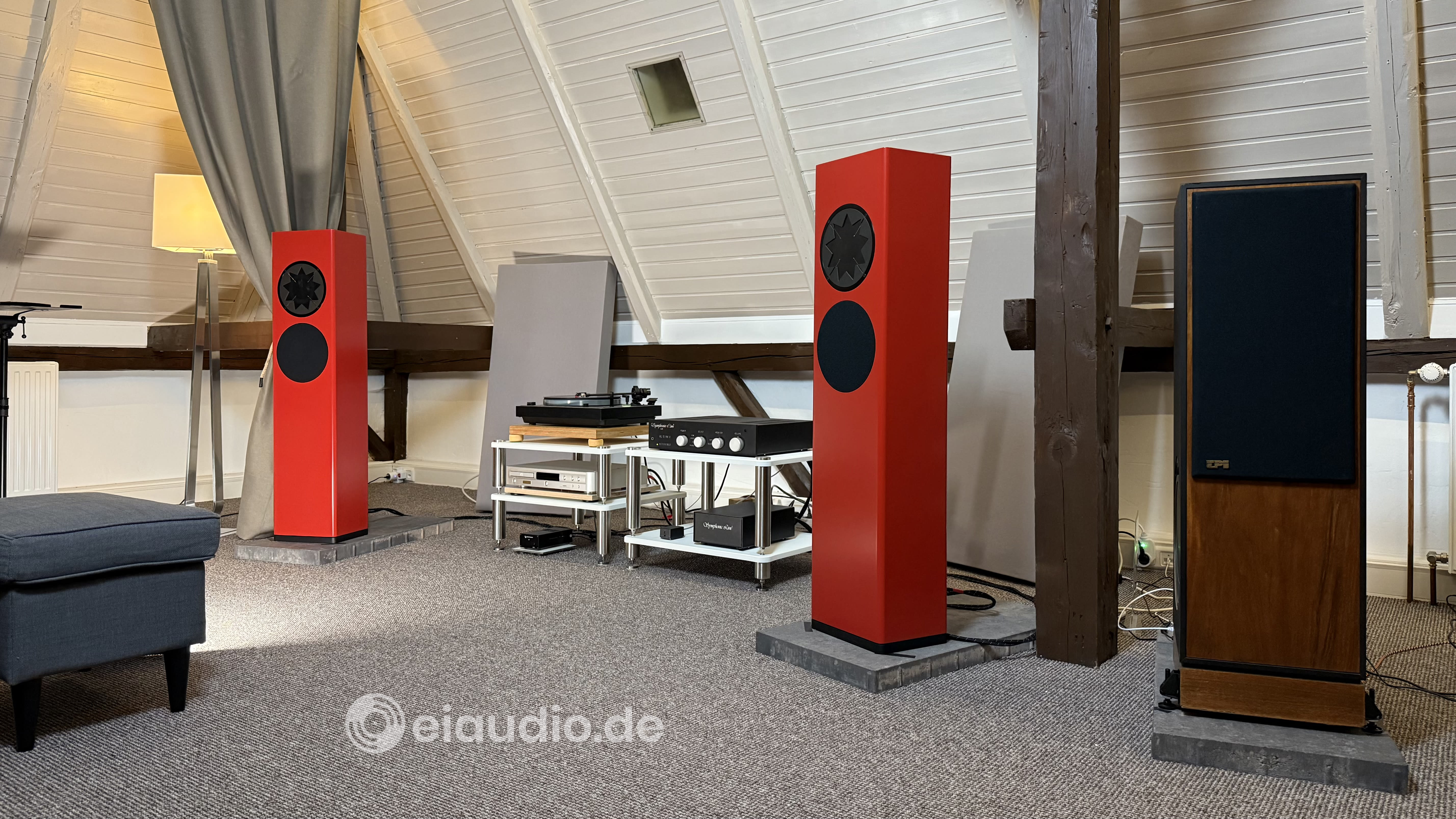 As our house was constructed in 1901 and still has the original wooden beams and floors, I place all my speakers on 40 kg concrete slabs. In fact, I first started doing so, when I learnt that simply doubling up the floor boards to 6 cm thickness and then adding a carpet on top was not enough to quiet resonances. The heavy concrete slabs have greatly helped to solve the issue since, but vibrations do play a role in less obvious positions as well. Some of them emanate from the HiFi system itself. To lessen their impact, the equipment driving the speakers is positioned on two separate racks that use steel tubes filled with silica sand. The rack on the right holds the Symphonic Line RG10 Reference HD amplifier with its two large and heavy transformers resonating at 50 Hz; and the rack on the left holds the sensitive optical and mechanical drive units of the Marantz CD player and the Thorens TD 320 turntable. Each of these devices is then further decoupled from vibrations by means of dedicated bases and absorbers.