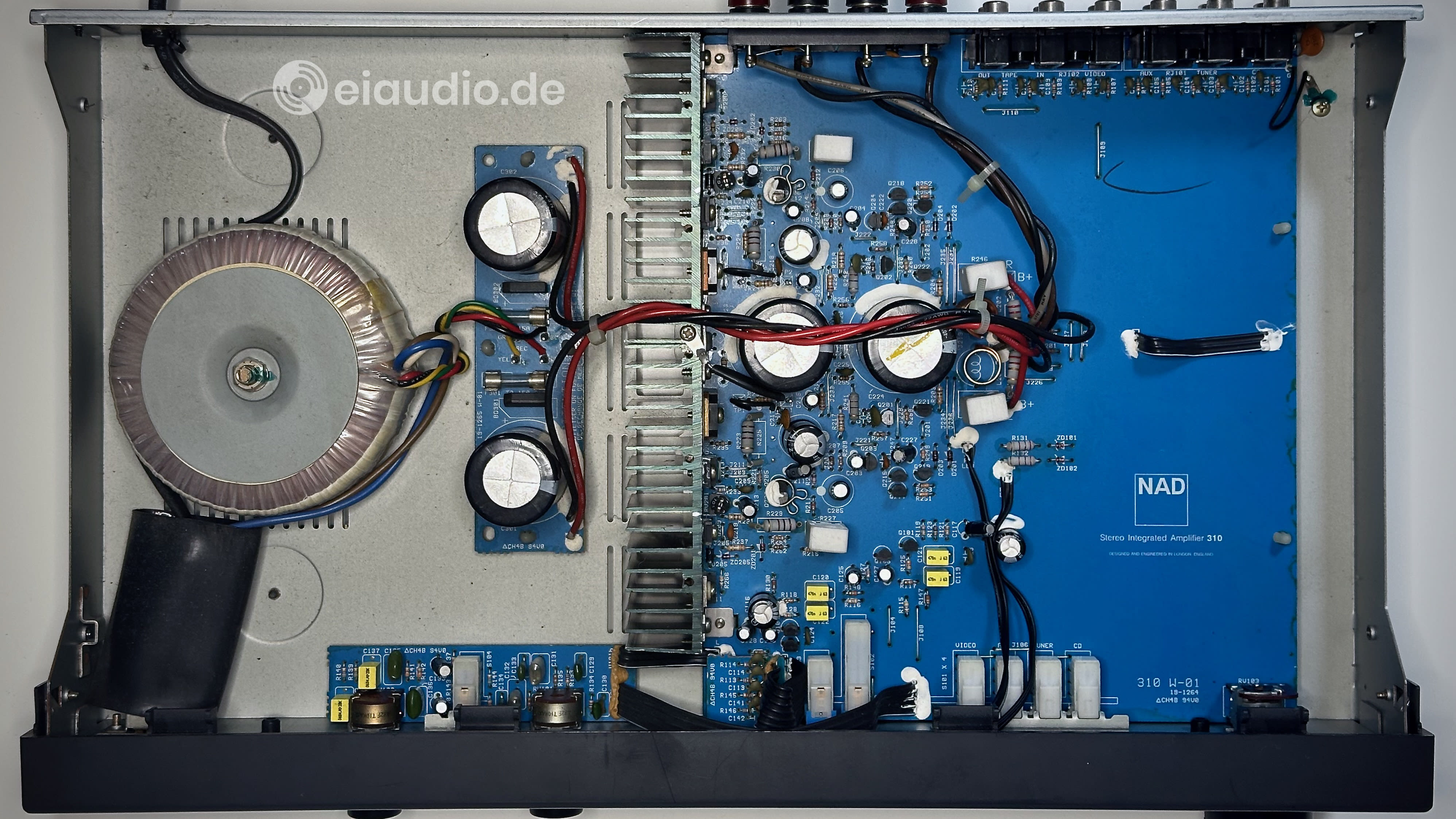 Seen from above, we can identify the AC power socket and mains filter (top right), the toroidal transformer (on the left), a rectifier (top center), two large audio grade electrolytic capacitors (right), two voltage regulators (top and bottom), as well as parts for the unit's soft start circuitry (center). The DC output socket is located bottom right.